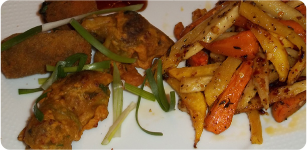 The pakora batter was gram flour, salt, paprika and cumin mixed
